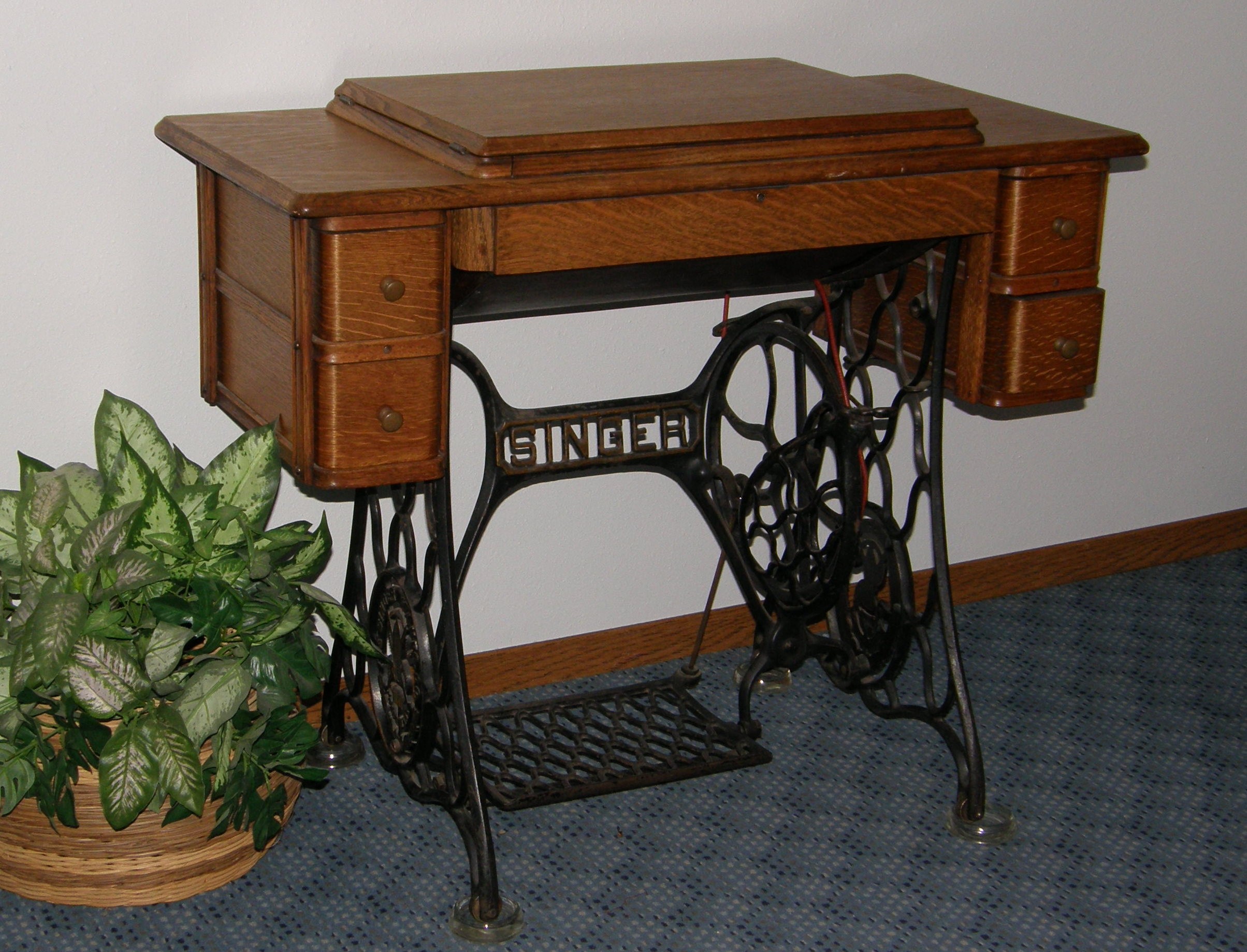 Jim Hammer ← Previous Next → Treadle sewing machine. The sewing machine folds out from the table in the center when needed.